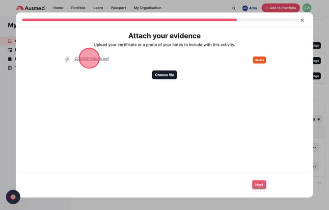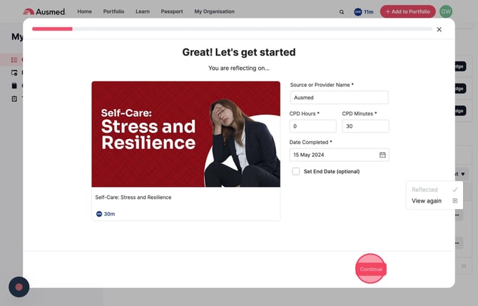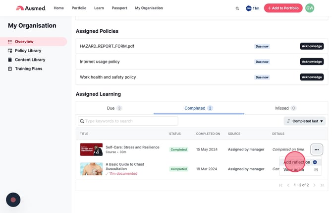 To download a certificate for training assigned to you by your organisation, you first need to add a reflection to document the activity in your Portfolio.