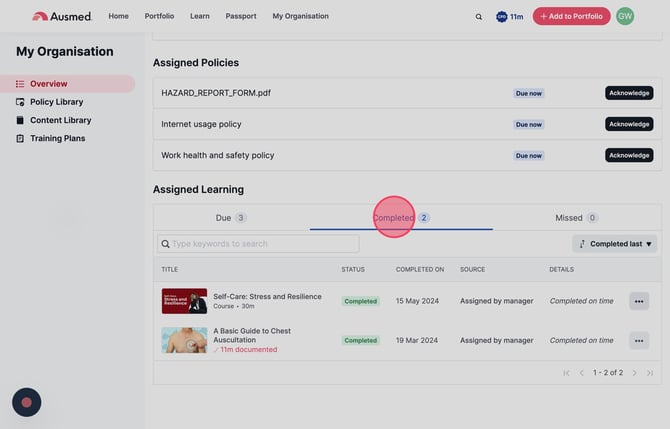- Next, click 'Overview' in the left-hand side menu. Then scroll down to your 'Assigned Learning' list and click on the 'Completed' section